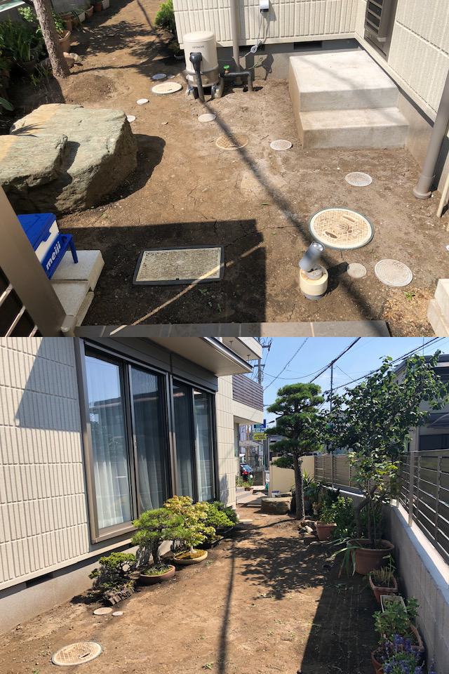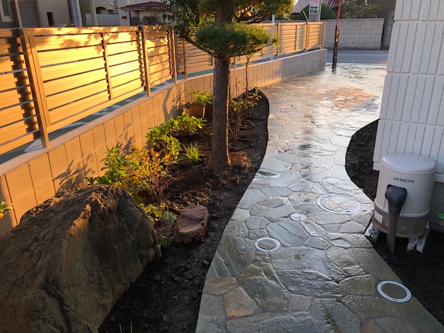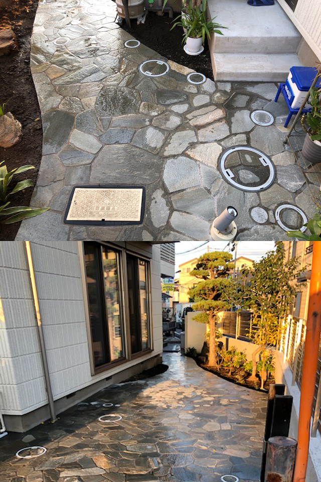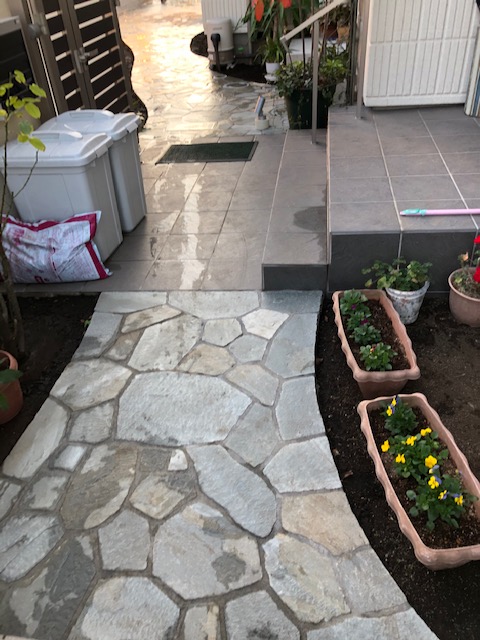高齢のお母様がお庭ん歩きやすく草木の手入れをしやすいよう乱形石ライノグレイにて施工させて頂きました。多かった汚水のマスも化粧マスにて仕上げました。
