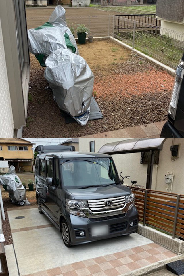 小平市 Before After Before After 施工場所 小平市 施工費用 200万以内 施工期間 約1週間 大切なバイクを守るため頑丈なサイクルポートを施工させて頂きました。土間打ち工事と目隠しのアルミフェンスも施工させて頂きました。