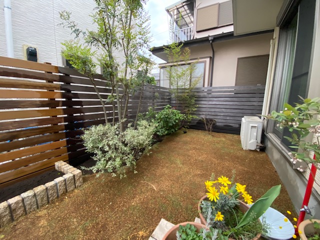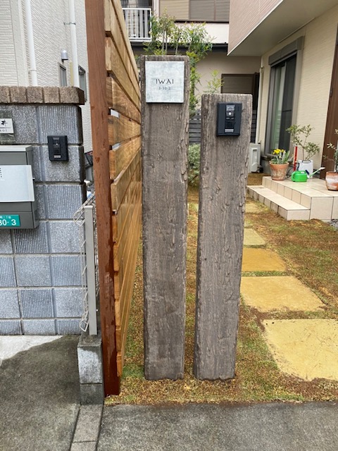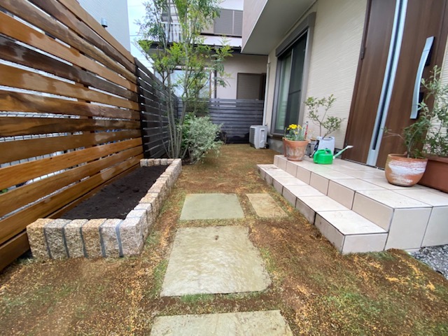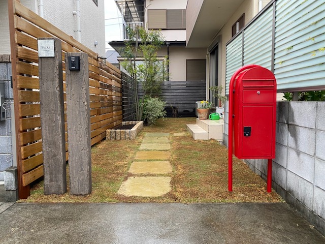 リピートのお客様宅、お庭のリフォームアプローチのリフォームをさせて頂きました。コンクリートのアプローチやブロックの門柱を壊し、天然木イタウバ材によるウッドフェンスの延長、玄関前には三丁掛けのピンコロによる花壇スペース、天然方形石による飛び石アプローチに庭から繋がる天然高麗芝、新たなコンクリート製の枕木にインターホンと表札を取付け、宅配ボックス付きのボビカーゴを設置させて頂きました。
