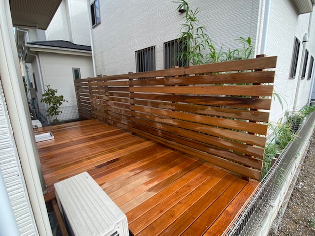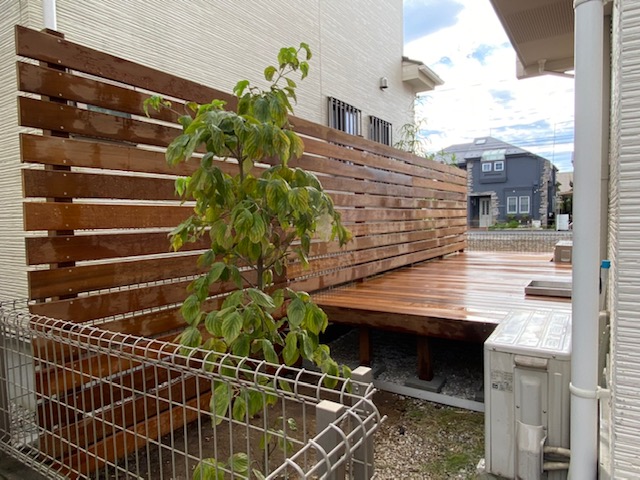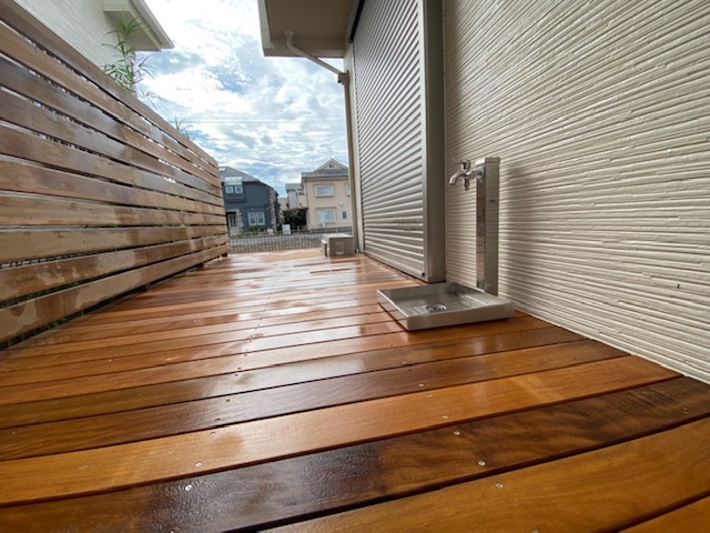 国分寺市 施工場所国分寺市施工費用100万〜施工期間4日天然木イタウバ材にてウッドデッキ及びウッドフェンスを施工させて頂きました。イタウバ材は非常に耐久性がありますので、ノーメンテナンスで30年近くご利用頂けます。立水栓もデッキの上に設置させて頂きました。