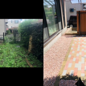 お庭部分もメンテナンスがなるべく無くなるように、防草シートとカラー砂利、バークチップ、インターロッキングにて仕上げさせて頂きました。