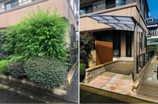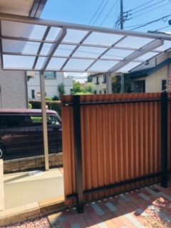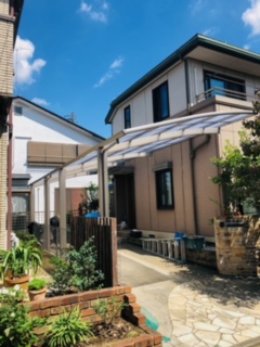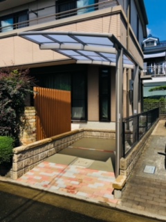 お庭部分を一部削り、軽自動車の駐車場に、メインのお車の駐車場にも自転車もカバー出来る10メートルの長さのカーポートを設置させて頂きました。