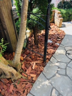 お庭部分もメンテナンスがなるべく無くなるように、防草シートとカラー砂利、バークチップ、インターロッキングにて仕上げさせて頂きました。