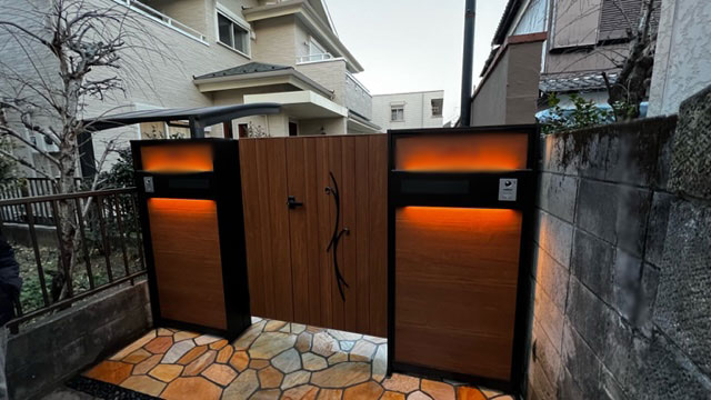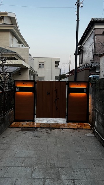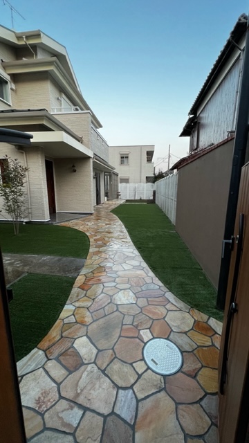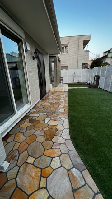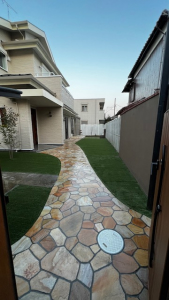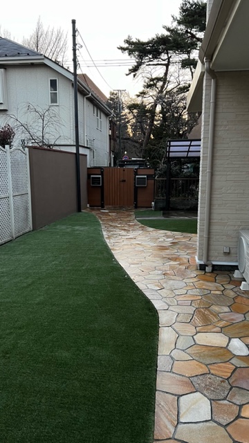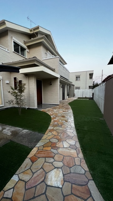 今までの大谷石とインターロッキング舗装を天然石の乱形石張りと人工芝に大きく変えさせて頂き、二世帯用にウォールタイプの門柱と門柱に合わせた特注の門扉にて仕上げさせて頂きました。